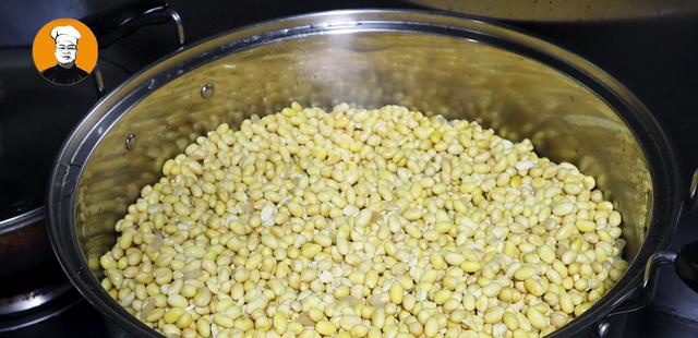 4、提前两个小时泡好的两斤黄豆,放入烧开的蒸锅中大火蒸2个小时。锅控干后倒入1000克低筋面粉,开中小火把面粉炒香,炒到微微发黄,然后盛出晾凉备用