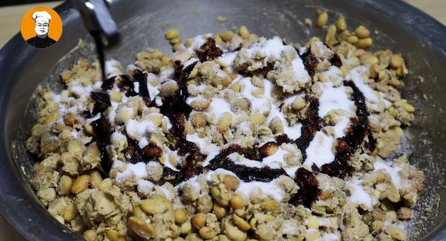 7、时间到时,把发酵好的黄豆转移到无水无油的盆中,再把发酵好的黄豆给它抖散,然后放入120克食盐、30克老抽,充分搅拌均匀