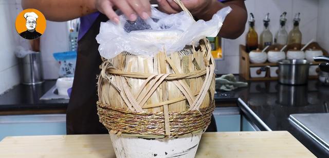 9、把豆豉全部装入坛子以后,用手压紧实,用食品袋封口,用哪个橡皮筋把坛口扎紧,摆在阴凉处,温度25度到30度左右,发酵20天左右