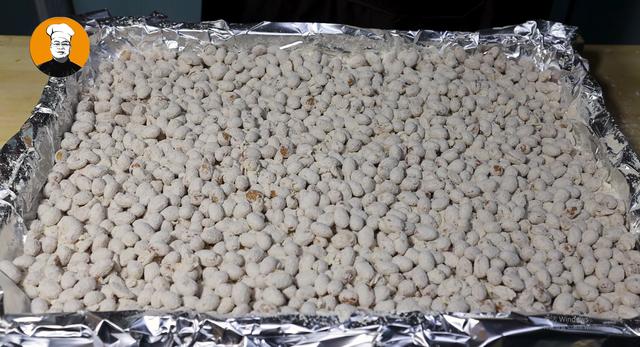 5、面粉中放入16克腐乳曲,充分搅拌均匀。黄豆蒸熟晾凉以后转移到包好锡纸的不锈钢盘中,再放入拌过腐乳曲的面粉,充分搅拌均匀,让熟黄豆上均匀的裹上一层面粉,再给它摊平整
