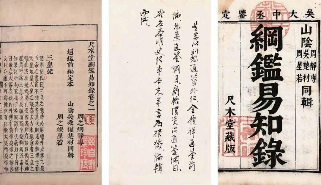 第二,提纲挈领,创立“纪”“编”。司马光的《资治通鉴》是中国第一部编年体通史,“网罗宏富,体大思精,为前古之所未有”。南宋时,朱熹根据《资治通鉴》改写成《资治通鉴纲目》,采用纲目全列的编年纪事体裁。前面的“纲”是历代史实的提纲,文字精简扼要,具有标题的作用;后面的“目”是对“纲”所举史事的详述。用纲挈目,藉示褒贬。迨至明、清,人们用这种体例编写史书者甚多,其最为世人称道的就是吴乘权的《纲鉴易知录》。