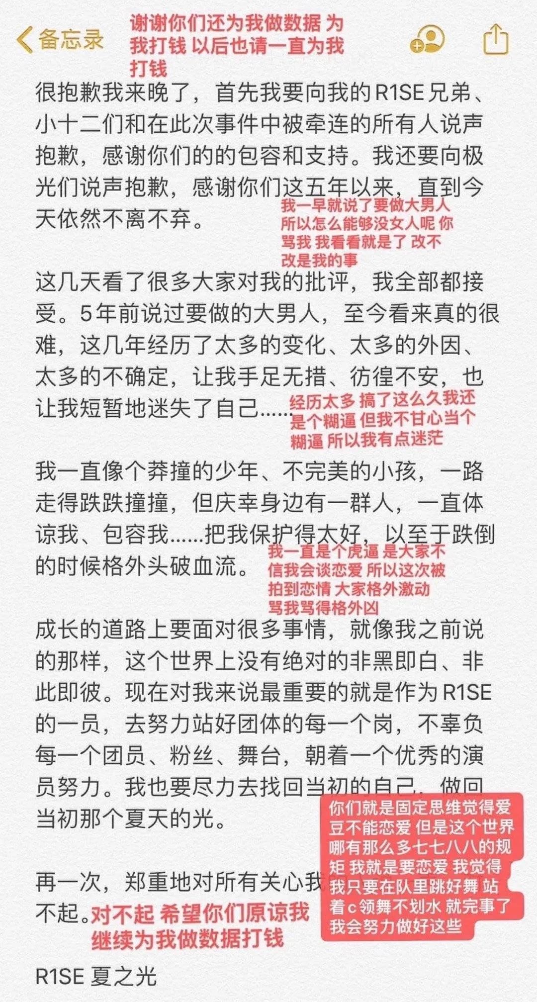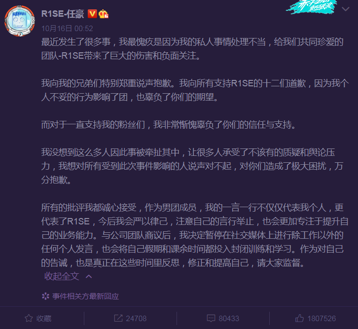 一连串证据都无从抵赖,最终,任豪发文默认一切,并向R1SE成员和粉丝们道歉。