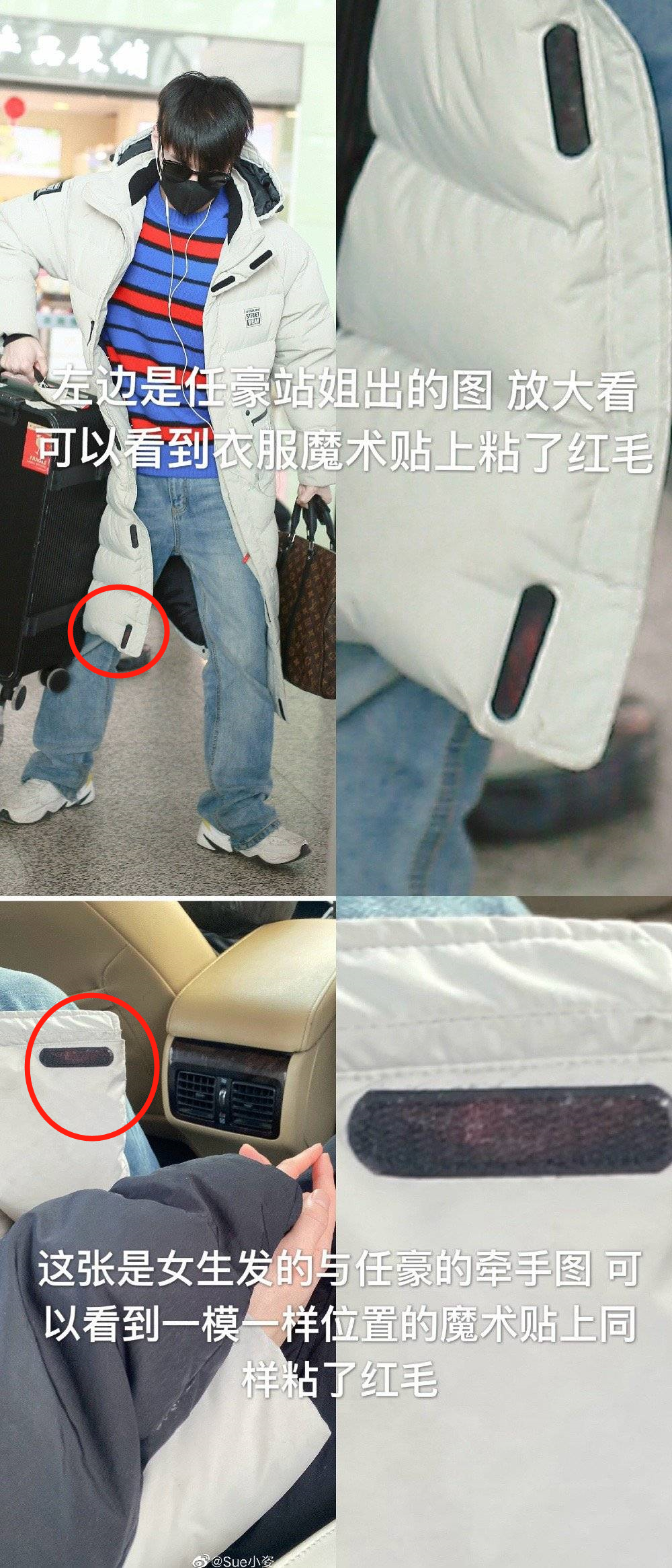 还有另一张两人牵手的照片,左边男生的白色羽绒服和魔术贴上粘的彩虹色毛毛,都和任豪的机场照对上了。