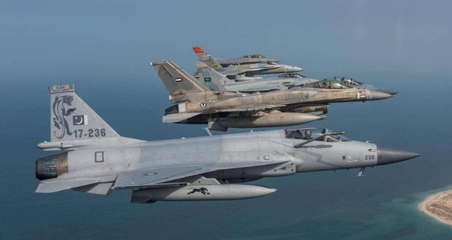 枭龙战斗机和美制F16编队飞行,但是当初F16的采购和维护都被美国以政治外交问题为借口卡了脖子。这也让巴基斯坦下了决心采购中国战斗机。
