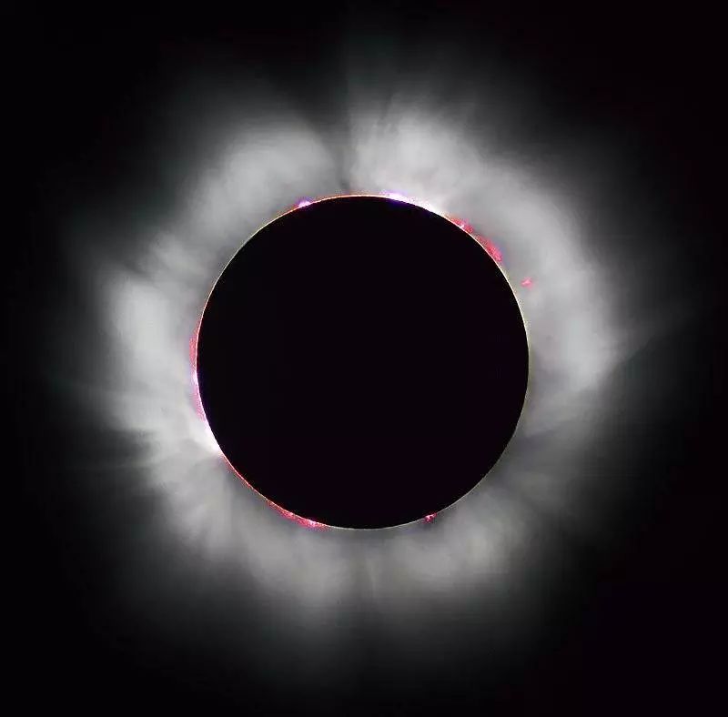 图解:日全食,于短暂的全食阶段可以用肉眼看见太阳的日冕。