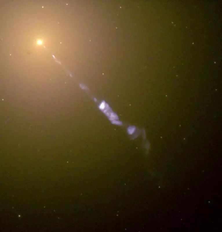 图解:黑洞喷射-哈勃太空望远镜拍摄的黑洞喷射照片。紫色线是由位于M87星系中心的一个超大质量黑洞产生的巨型等离子体射流发出的光。