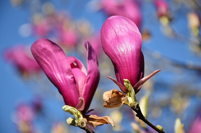 紫玉兰是园林中落叶小乔木,北方春季主要的观花乔木行道树,是中国特有的植物,株型中等大小高度5~12米,直径10~40公分,生长速度快,树形优美。花一年开两次,直径6~12厘米之间,有10~14枚花瓣,气味芬芳。
