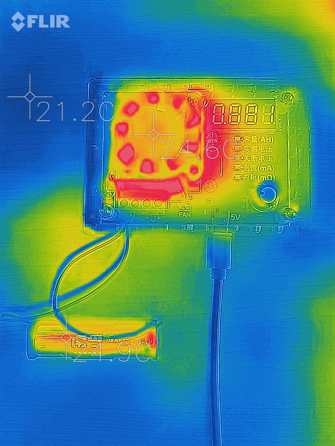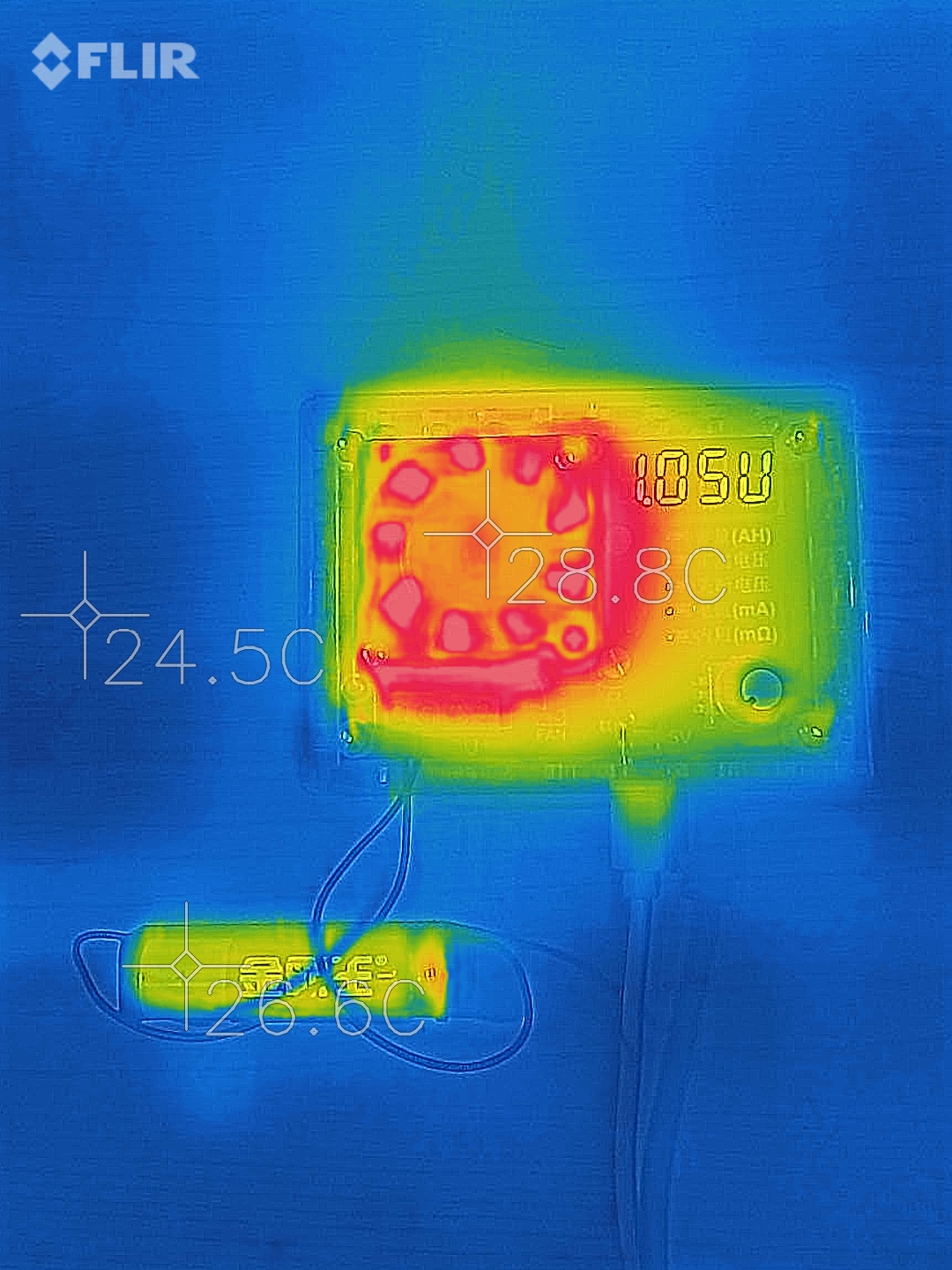 从红外热成像仪的记录来看可以看到南孚电池的放电温度为 24.9℃,考虑到拍摄环境是夜晚,室温比较低。总体来看,发热情况非常轻微,丝毫不用担心。