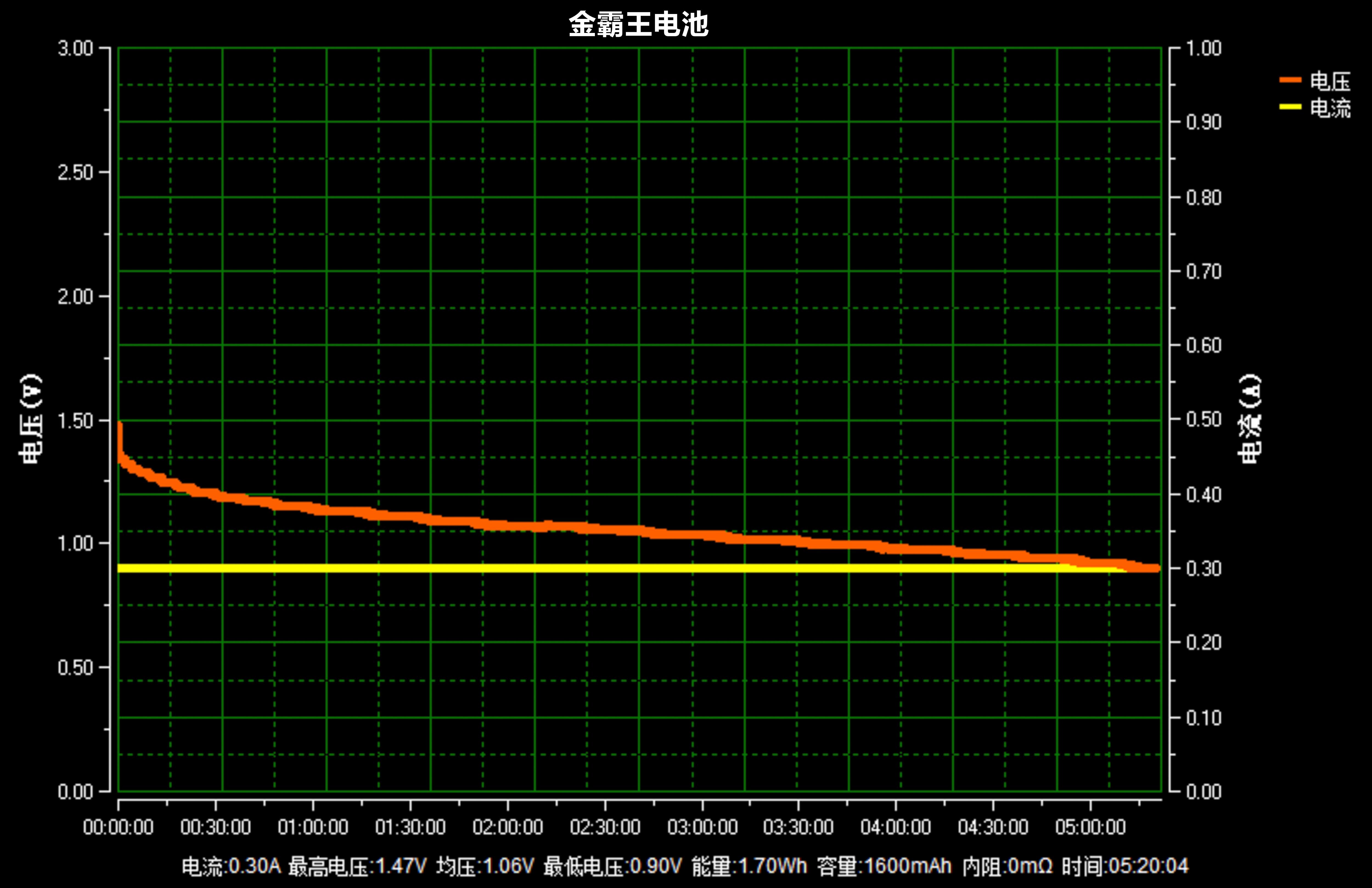 通过电池检测仪可以看到金霸王电池的初始电压是 1.59V,通过 300mA 的稳定电流放电,经过 5 个小时 20 分钟 4 秒,电压下降至 0.9V 关断电压,平均电压1.06V,测得电池容量为 1600mAh。