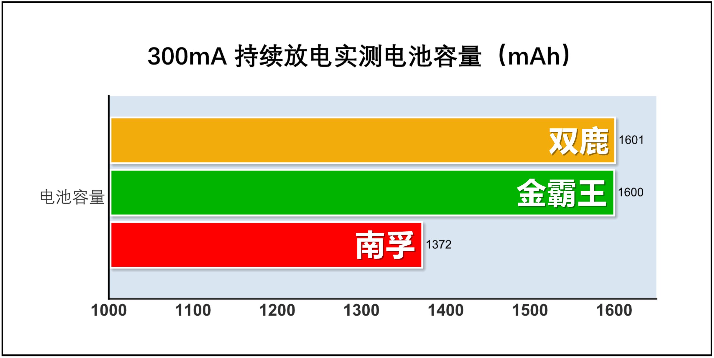【电池容量】:双鹿 ≥ 金霸王 > 南孚聚能环 2 代