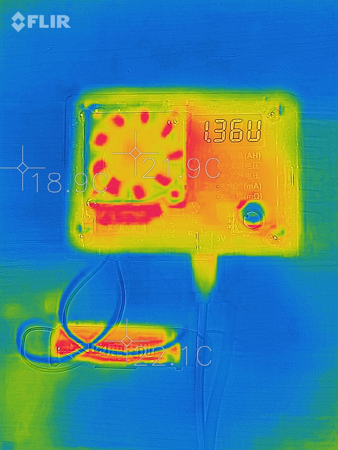 从红外热成像仪的记录来看可以看到双鹿电池的放电温度也比桌面高一些,达到了 22.1℃ 左右,拍摄时间是夜晚。总体来看,发热状况不易察觉,可以放心的使用。