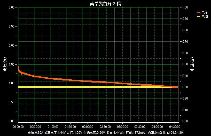1️⃣『南孚聚能环 2 代』:初始电压:1.59V,300mA 持续放电测得电池容量 1372mAh(批次数据存疑,后续评论更新)