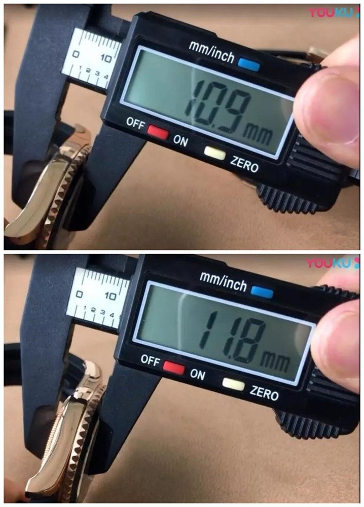 VS表径和原版一样都为40mm,我们来看一下厚度。原装厚度为10.9mm,而VS的比原装厚了0.9mm,在有专业卡尺测量的情况下,厚度也不失为一种快速鉴别的方法。