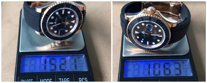 虽然VS这款游艇做了包金处理,但是在重量上和原版还是有非常明显的差距。无论外观再怎么高度相似,都逃不过重量这一坎。我们可以看到原装游艇是152g,而VS包金游艇重量只有106g。