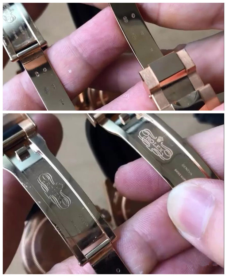 两者表扣对比,正品的表扣印字和VS的处理工艺是不一样的。VS表扣印字像印上去的,而原版完全就是刻上去的。当然,贵金属的各种标识都有。