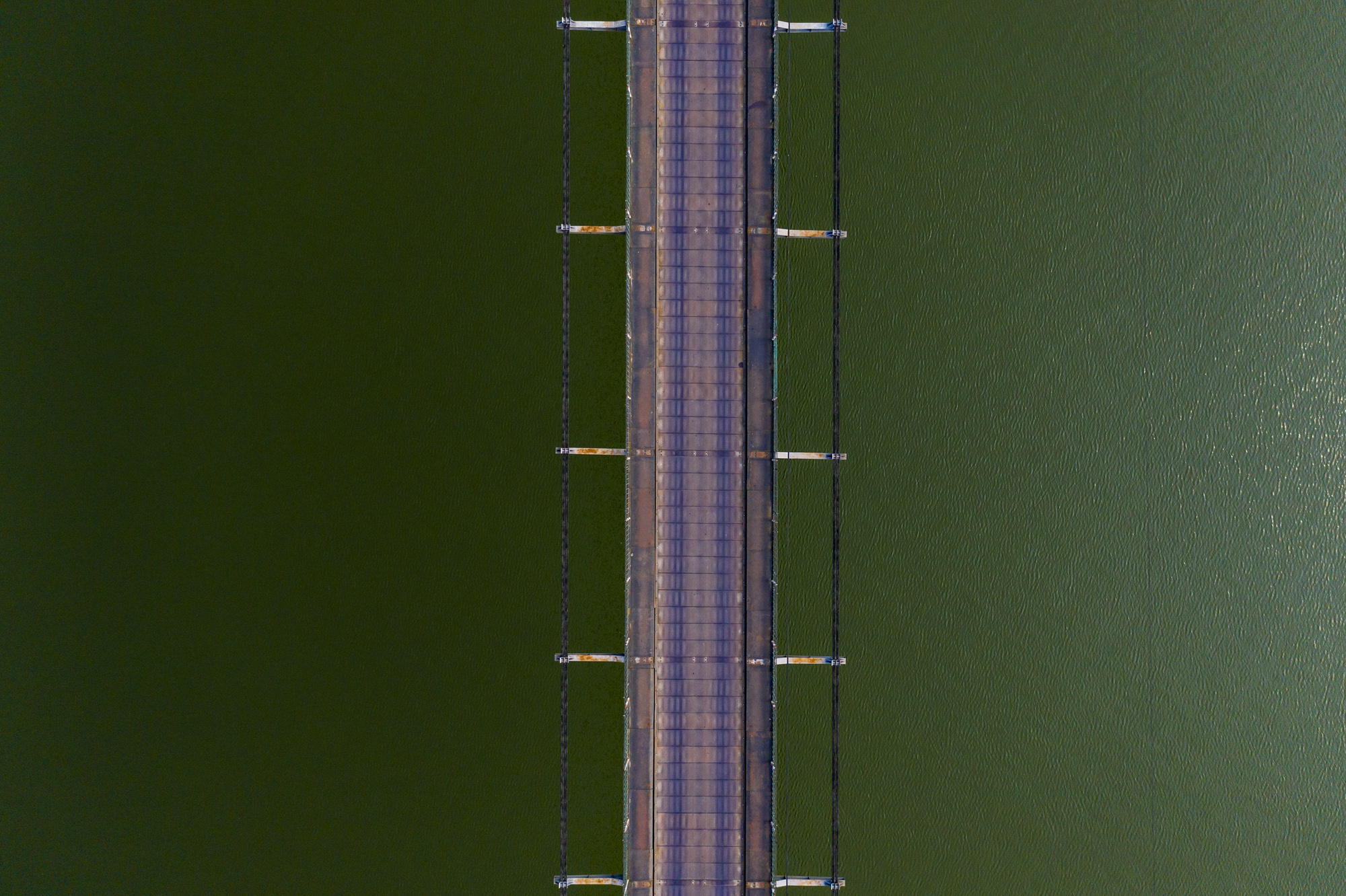 车辆行驶在桥上,由于没有桥墩,铁桥晃动得厉害,铁板也是嘎嘎作响,站在上面让人害怕。
