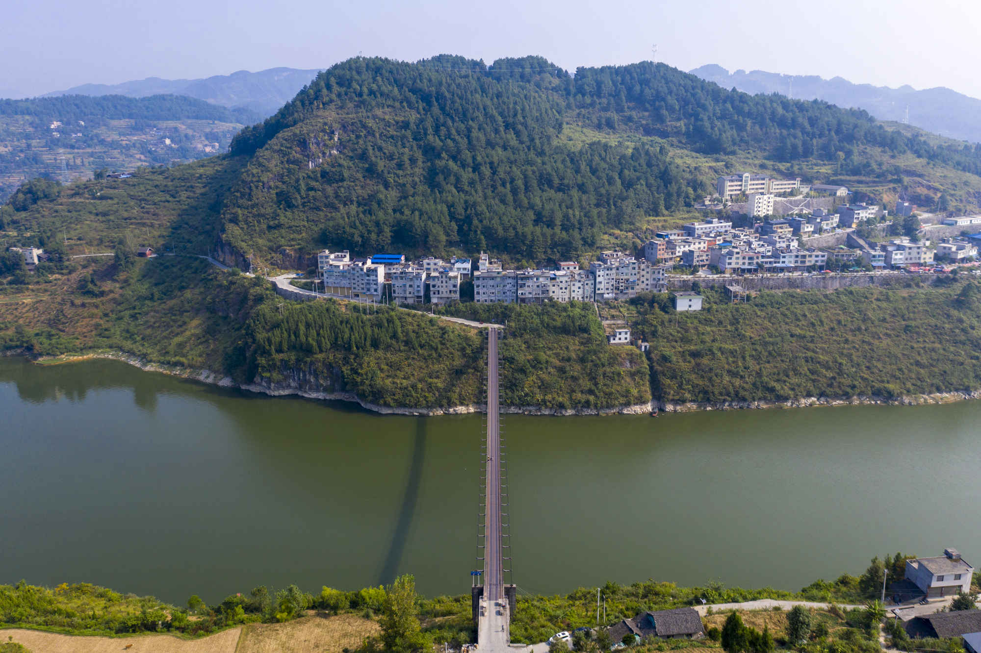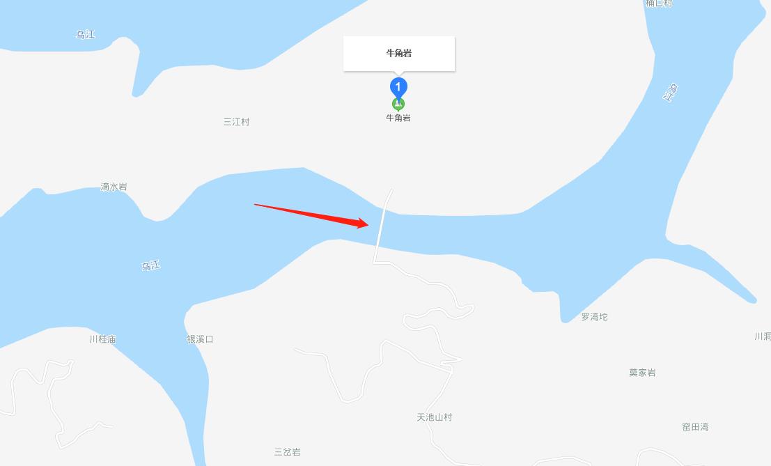 这座铁索桥位于贵州思南县长坝苗族土家族乡,距离思南县城50公里,距离省会贵阳260公里。它飞架于乌江之上,北边是一座山峰叫牛角岩,山下有个小村落,而乌江就在村前流过。