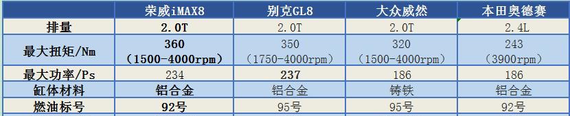 该发动机在同级别中到底表现如何?我们对比来看。从动力上来看,荣威iMAX8上这款2.0T发动机最大扭矩可达360Nm,是几款车型中表现最好的,最大功率234马力,仅次于别克GL8;从热效率上来看,该发动机在刚刚以39.52%的最高热效率获得了中汽研的“能效之星”认证,是几款产品中热效率最高的一个;从振动噪声水平上来看,这款发动机的怠速噪音是几款车型中最小的一个。另外,与荣威iMAX8同为2.0T的别克GL8和大众威然却只能使用95号汽油,因此荣威iMAX8使用成本更低。