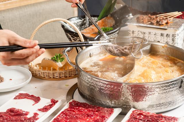 吃牛肉火锅,需要一个精致的小笊篱,服务员把牛肉端来,待汤沸时,要将牛肉倒入小笊篱中,一同浸入汤中,拿筷子搅一搅,以确保每片牛肉都受热均匀,如此,涮上几秒即可熟。
