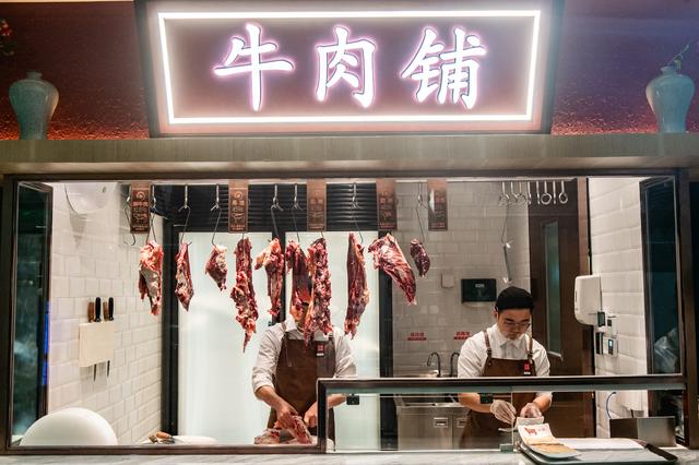 像上海牛肉火锅的“隐形老大”左庭右院鲜牛肉火锅,全国有77家门店,每家店门口,都有一个专门切牛肉的档口,名为“牛肉铺”,几个小哥在透明的玻璃窗后切牛肉、摆牛肉,都是“客人现点,小哥现切”。