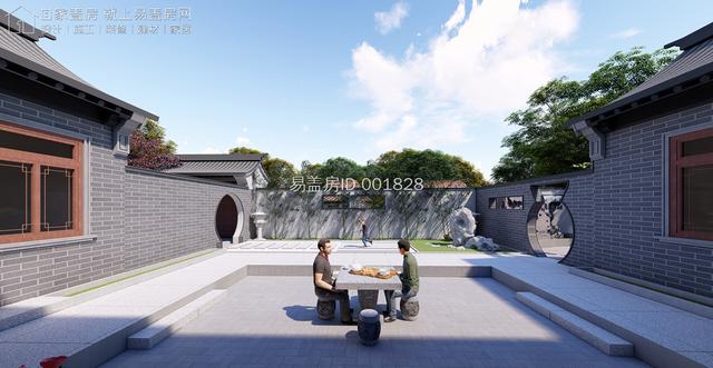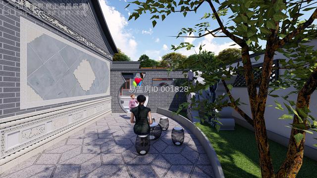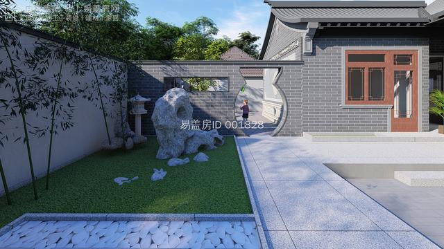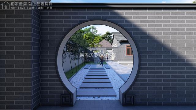 院门旁边设置多个中式窗洞,其雕花的设计,增加其整体的灵动感;庭院内部增设传统影壁,与院门结合,形成氛围古朴的入户空间。