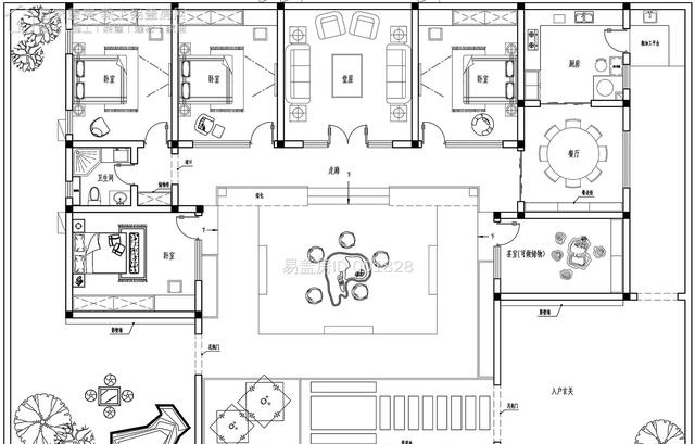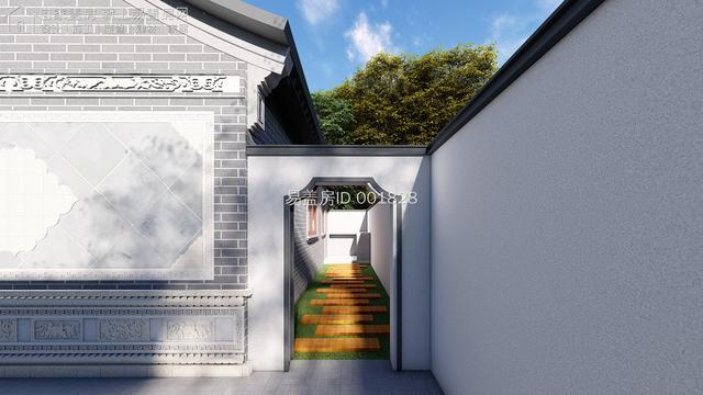 院门后方预留有部分空间摆放高大树木进行遮挡,保证整个院落的隐私。此处空间业主可根据喜好和实际情况进行选择。