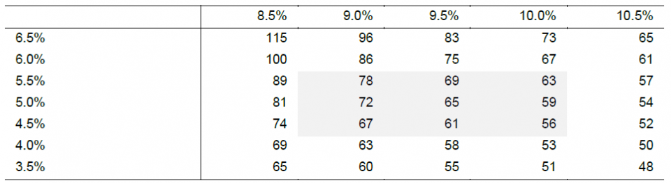 图9:绝对估值相对折现率和永续增长率的敏感性分析(元)