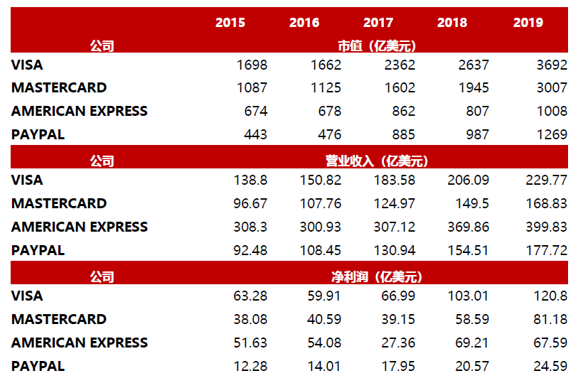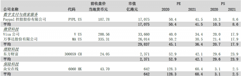 对标Visa、Mastercard、Paypal、American Express这些美国金融科技大牛股,市值在1000亿-3000亿美元之间,PE(TTM)分别为41倍、46倍、80倍、21倍,中枢在40倍左右。