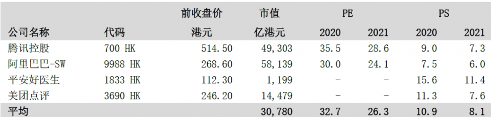 由于公司业务具创新型,暂无完全直接对比公司,考虑公司业务主要服务互联网用户,在以科技驱动的平台上提供多元化服务,已形成具规模的生态系统,因此选取提供多元化服务的平台型互联网公司作为整体PE估值及PS估值的可比公司。