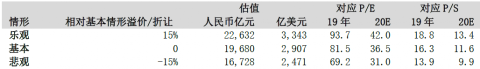 鉴于公司估值还将受到上市时市场氛围、投资者对公司的关注度等因素影响,认为乐观情形下公司估值可达到人民币22632亿元(相当于3343亿美元),悲观情形下估值为人民币16728亿元(相当于2471亿美元),即合理估值区间为16728-22632亿元(相当于2471-3343亿美元),对应31-42倍2020年预测PE及9.9-13.4倍2020年预测PS。