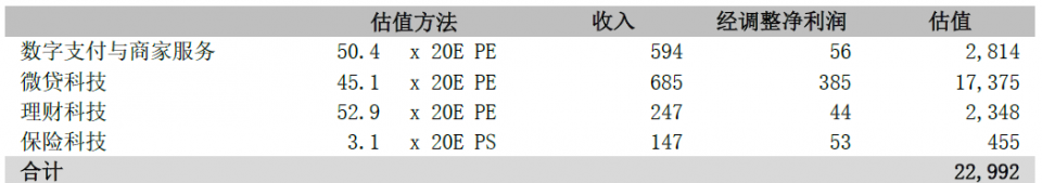 计算各业务板块重要子公司对公司净利润的贡献(创新业务及其他规模较小未被计入在内),并将负责集团整体研发、运营、投融资等平台职能公司产生的盈利/亏损根据各业务板块收入占比分配至各业务板块,估算预期2020年数字支付与商家服务、微贷科技、理财科技及保险科技分别占经调整净利润的比重为10.4%、71.5%、8.2%及9.9%。各业务分别参考同样估值均值,赋予数字支付与商家服务业务50.4倍2020年预测PE,赋予微贷科技业务45.1倍2020年预测PE,赋予理财科技业务52.9倍2020年预测PE,赋予保险科技业务3.1倍2020年预测PS,计算各业务分部估值并相加后得到公司估值为22992亿元。