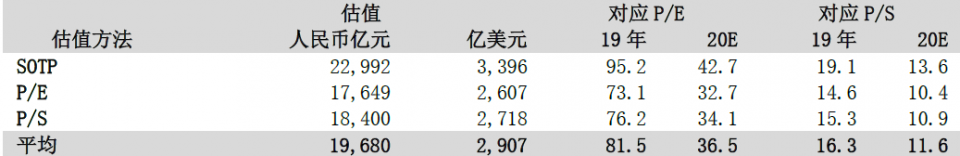 公司业务具有创新性,并已形成独特的生态系统,这给估值带来了难度。我们采用SOTP、PE、PS三种估值法对公司进行估值,并取均值,得到在基本情形下,公司估值为人民币19680亿元(相当于2907亿美元),相当于36.5倍2020年预测PE及11.6倍2020年预测PS。
