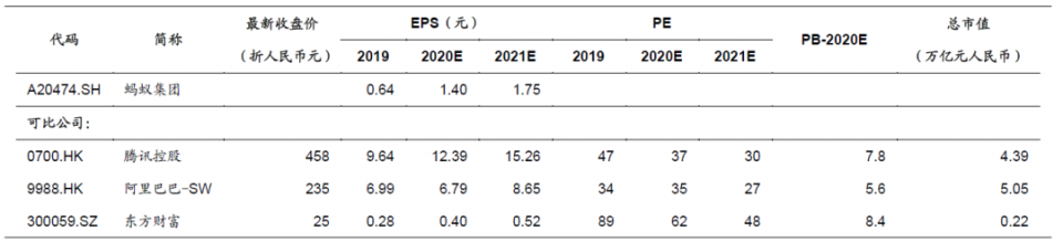 蚂蚁集团所从事的业务具有较强的独特性,选取与其业务具有部分重合或者紧密联系的互联网公司作为对标,采用PE法估值。参考可比公司估值并考虑到规模因素,给予公司40-60倍2020年PE,对应的合理价格区间是56-84元。
