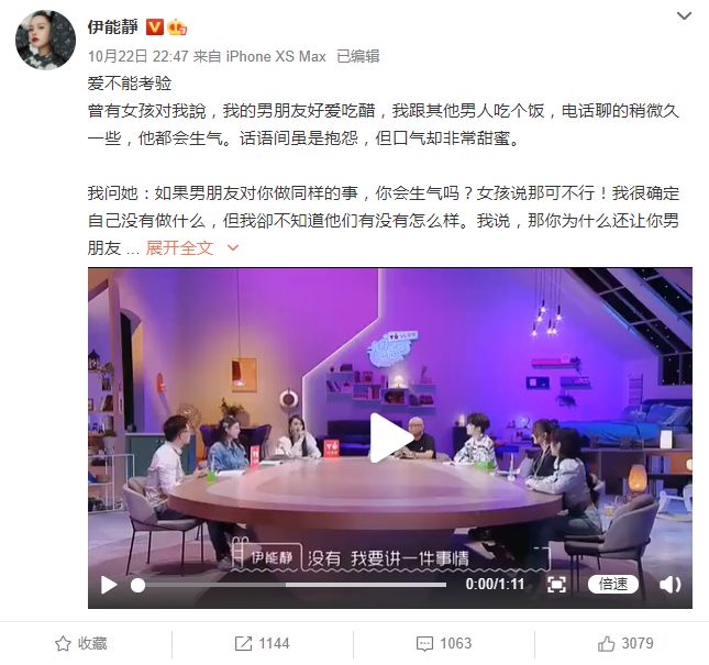 10月22日,目前在节目中充当恋爱观察员的伊能静发文分享自己的爱情观,她用自己认识的一位女孩和男朋友的故事态度笃定地写道:“爱是不能考验的,人性非常脆弱。”她表示有很多好好的爱情,就是这样被考验折腾没的,“相爱还是纯粹一点好。”她还开玩笑说:“以后回家要对秦先生好一点。”