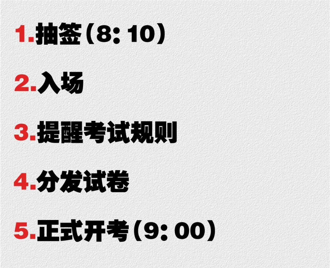 8.10全体学生在二楼浙江教室集合,进行抽签,学生根据自己抽到的座位号,到负一楼考场进行入座考试!等全部学生入场后,由监考官给大家讲解考场规则,并分发试卷,九点正式开考。