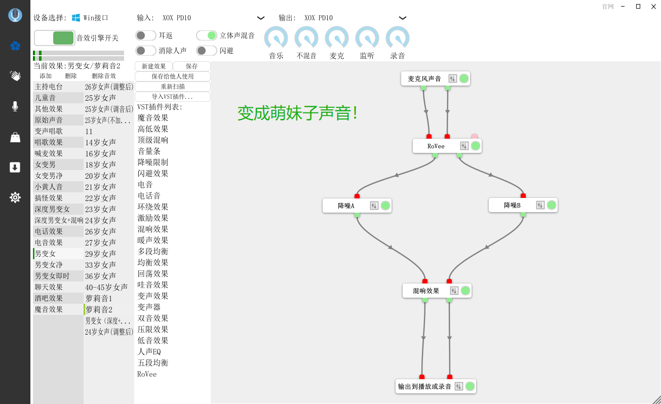 试一下你的麦会不会出现上述的问题,如果不会,那就可以开始变声了。在变声软件当中会有一些调试好的主播电台音,这些音效可以将我们的声音变得有磁性,不过由于每个人声音频段的起伏有偏差,所以这些音效并不是每一个都适合你,你需要找到其中的1-2个音效就行了。