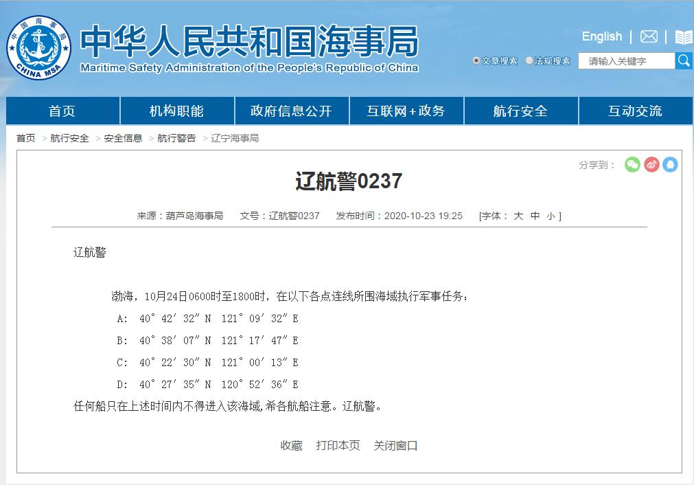 葫芦岛海事局发布航行警告:辽航警0237,渤海,10月24日0600时至1800时,在以下各点连线所围海域执行军事任务: