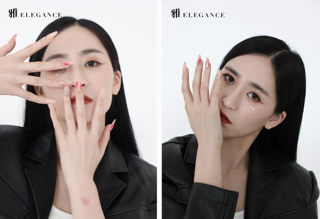 “雅”系列美甲款式,采用绿色和红色两种色调展现工作和生活两种状态,贴片和晕染,就像面具撕掉和情绪变化,充满无限想象。