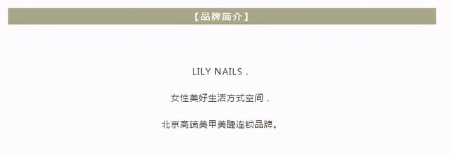 LILY NAILS创立于2001年,总部位于北京时尚最前沿地带朝阳三里屯商圈,是国内美甲美睫行业领先的直营连锁品牌。业务范围涵盖美甲、美睫、按摩、spa、美肤、脱毛、半永久等细分领域,共计拥有23家全国门店,其中北京16家。