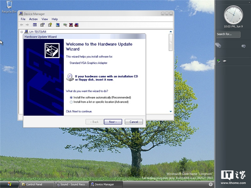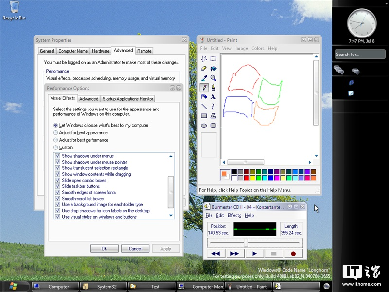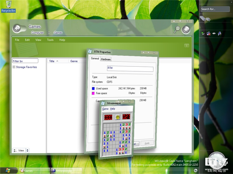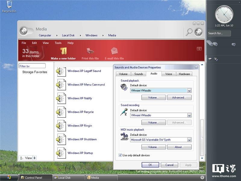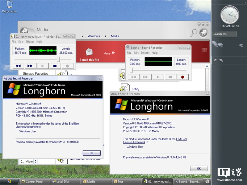 该 Build 的设备管理器安装驱动的功能恢复了,可以正常使用,不过安装显卡驱动后还是可能要在开机时需要按 F8 选择以 VGA 模式启动(Enable VGA Mode)才行。音频相关组件也在该 Build 中重新加入,不过因为没有 Windows Media Player,默认播放器为录音机(sndrec32.exe),且仅支持 Wave 音频格式;另外实测 Windows Media Player 9 可以在该 Build 上正常安装运行。