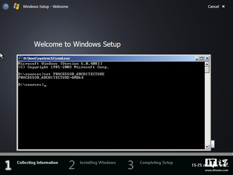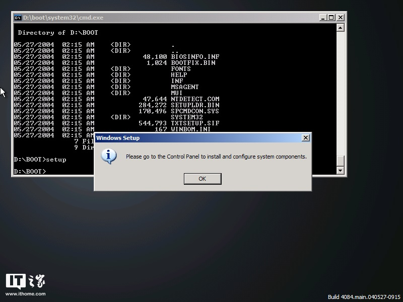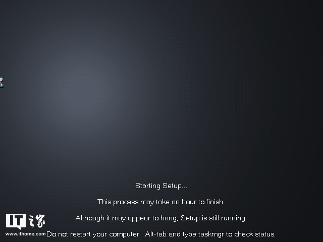 该 Build 安装到第二阶段时显示的文字提示由原来的“Starting Setup... one moment please”(正在启动安装... 请稍候)改成了“Starting Setup... This process may take an hour to finish. Although it may appear to hang, Setup is still running. Do not restart your computer. Alt-tab and type taskmgr to check status. ”(正在启动安装... 安装流程可能需要 1 个小时才能完成。即使有时安装程序看起来停止响应了,它实际上还在运行。不要重启电脑。按下 Alt+tab 并输入 taskmgr 来查看电脑状态。)按下 Alt-tab 即可切换到随安装程序后台打开的命令提示符窗口,并可以输入 taskmgr 打开任务管理器。实际上 Build 4081 起就已经有了这个设计,且安装流程在 4081 就已经变得十分缓慢了;另外几乎所有采用 WinPE + Wim 安装方式的 Windows 系统(包括之前的 Longhorn 和后来的正式版 Vista、Win7-10)都可以在安装程序运行时按下 Shift+F10 打开命令提示符窗口。显然 Longhorn 开发团队此时意识到安装程序花费的时间太多了。