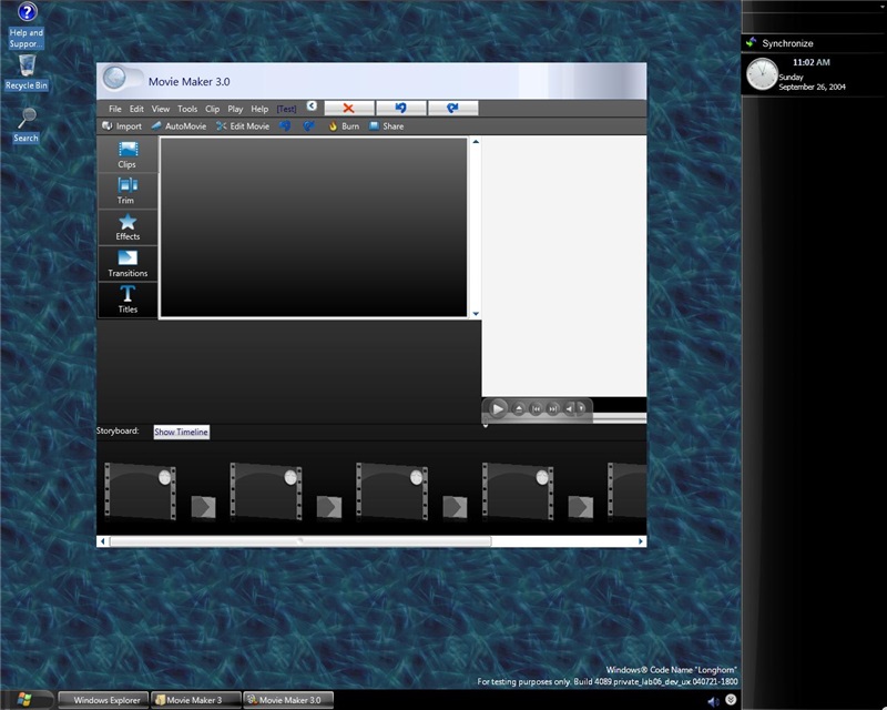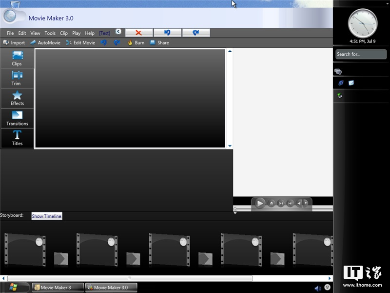 2. Movie Maker 3.0 ——新版的 Movie Maker,界面很符合 Jade 主题,但是完成度不高,Bug 很多。它位于 C:\Windows\Program Files\Movie Maker 3\MovieMaker.exe。它还自带了一些示例文件。