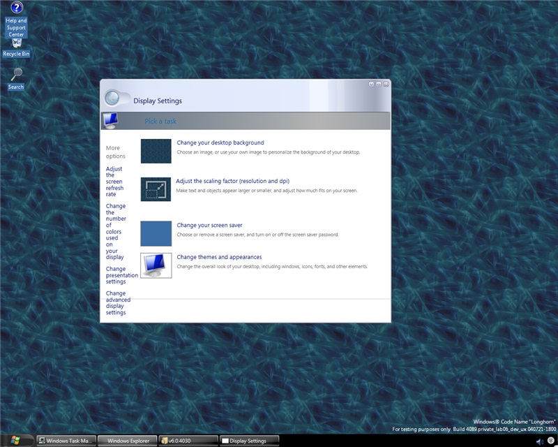 这个 Build 并未泄露,仅有 2 张截图流传。其中一张展示了一个基于 Avalon 框架(后来的 Windows Presentation Foundation)的新版 Windows Movie Maker;另一张展示的是同样基于 Avalon 框架的新版显示设置控制面板(正式版 Vista 的个性化控制面板设计与此类似)。