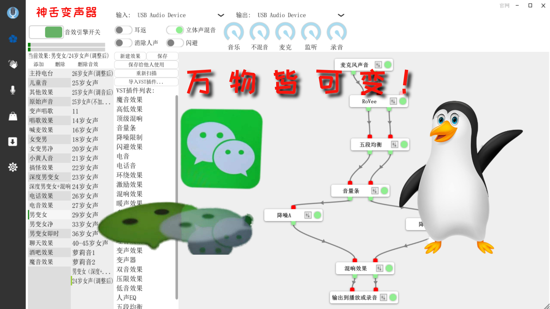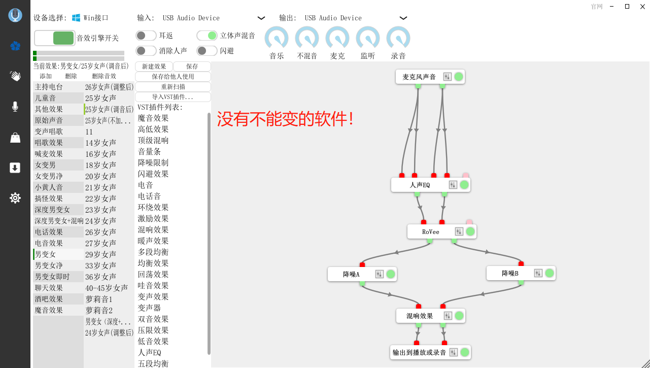 我们将变声软件安装并打开,这个过程非常的简单,在此就不展开叙述了。安装完毕之后,我们的变声软件会自动的帮我们设置好变声的线路,并自动选择一个默认的男变女效果,我们可以先使用这个变声的效果在两个软件中试一下是否兼容。