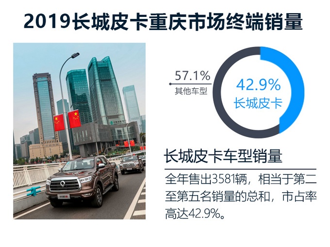 长城炮作为原产于重庆的皮卡,是地产车的同时,长城品牌也是重庆的强势品牌。以皮卡车市2019狭义皮卡市场实销数据来看,长城皮卡在重庆全年售出3581辆,相当于第二至第五名销量的总和,市占率高达42.9%,是实打实的强势品牌,可见长城皮卡凭借经济、皮实、耐用的口碑早已深入人心。