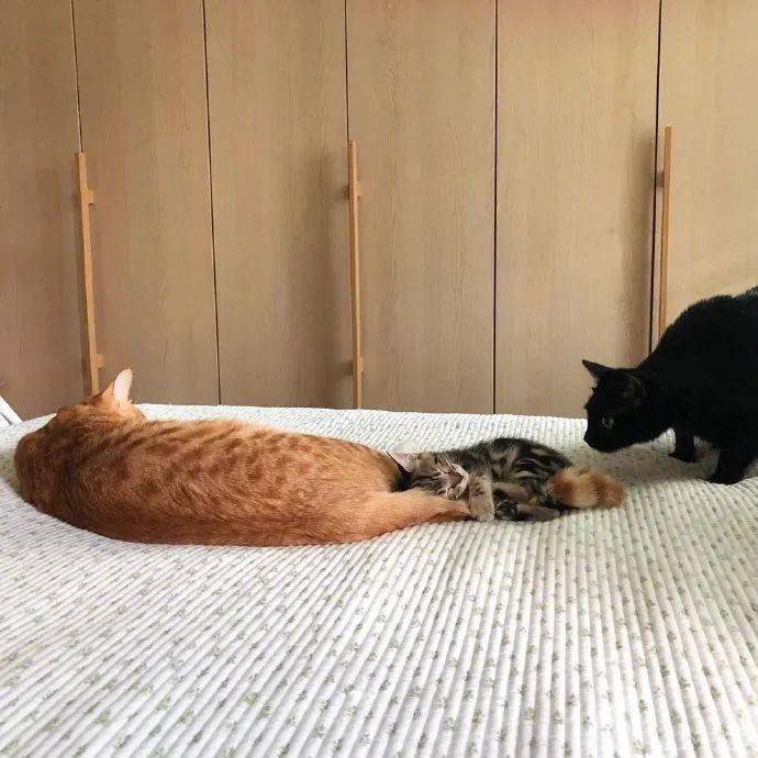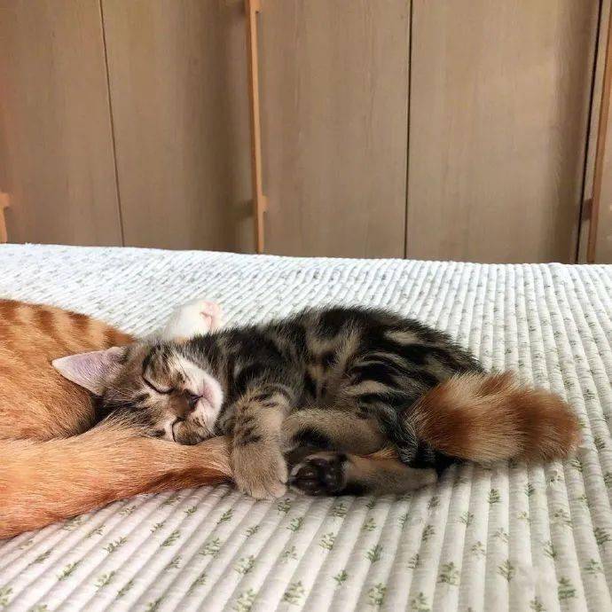 网友家本来有两只原住猫,但是有一次领养了一只小奶猫,大概三个月左右的样子,可能是因为刚离开猫妈妈不久,很没有安全感,总是粘着家里的大橘猫。就连睡觉也要抱着橘猫的大尾巴才睡得香。