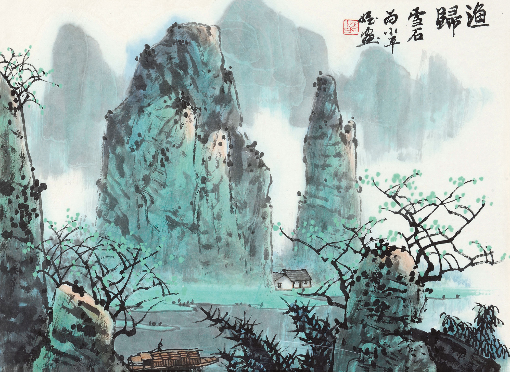 桂林山水甲天下 ,白家山水甲桂林 、自家山水,即画家白雪石之独具风貌的山 画法 。白雪石师承赵梦竹、梁树年的北派山水,画风端庄厚重,吸收了 南派山水秀雅轻灵之精华,其作品具有水彩画的秀润,又有版画的纯净,独具装饰之美。白雪石由于爱桂林的山 、漓江的水 ,画下了大量以桂林山水为题材的作品