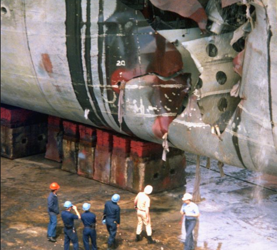 ▲这张老照片展示的是1991年,伊拉克的水雷对美军两栖舰黎波里号造成的破坏