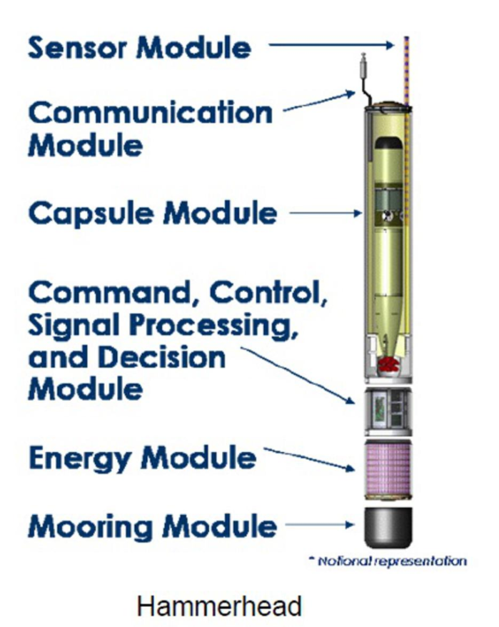 如今,面对潜在的横跨北大西洋和大平洋的海战风险,美国海军正在准备新一代的智能水雷装备,以此来应对潜在的敌方的海军潜艇威胁。这种新的智能水雷如前文所述,被称为“锤头”水雷,这是一种模块化设计的水雷,其主要模块包括一个“胶囊模块”(其中包括受动器)、一个系泊模块、一个能量模块、一个传感器模块以及一个通信模块。其中,胶囊模块内含有一套Mark(Mk.)54轻型混合自主制导鱼雷。