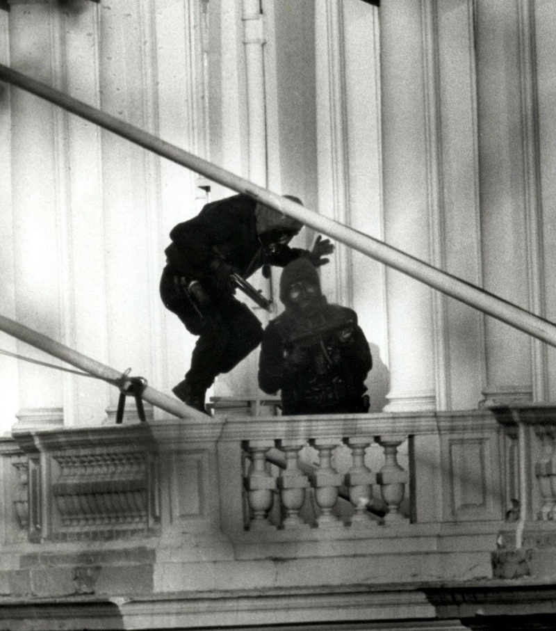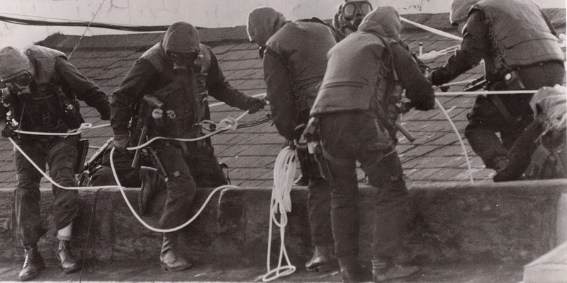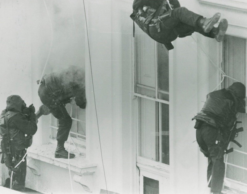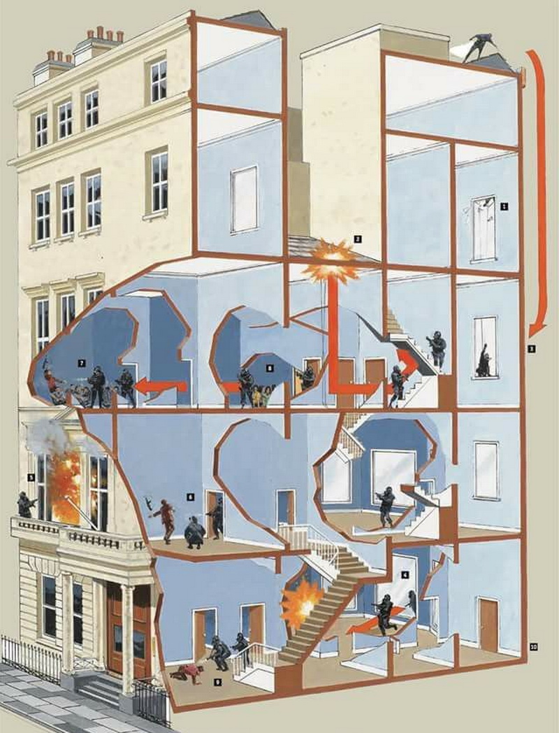 SAS队员抵达阳台后,由一名队员对门窗进行爆破。炸开通道后,其他躲进角落的队员鱼贯而入。后续队员也使用垂降和从后门进入屋内清剿武装分子。